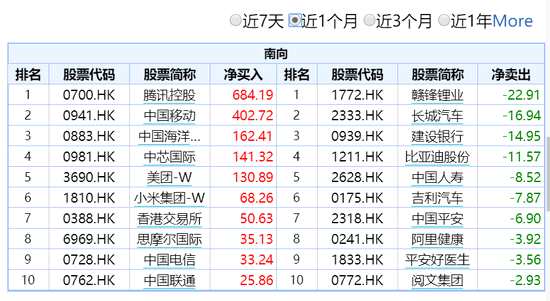 近一個月來看,南下資金買入騰訊近700億,中國移動逾400億,中國海洋石油、美團(tuán)、中芯國際、三大運(yùn)營商等也獲大幅買入。