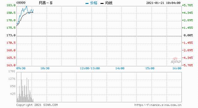 1月21日消息,網(wǎng)易一度漲超5%,報182.90港元,刷新歷史新高,總市值突破6200億港元。