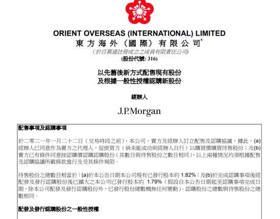 東方海外先舊后新配售1140萬股 中遠(yuǎn)海運(yùn)持股減少為73.66%