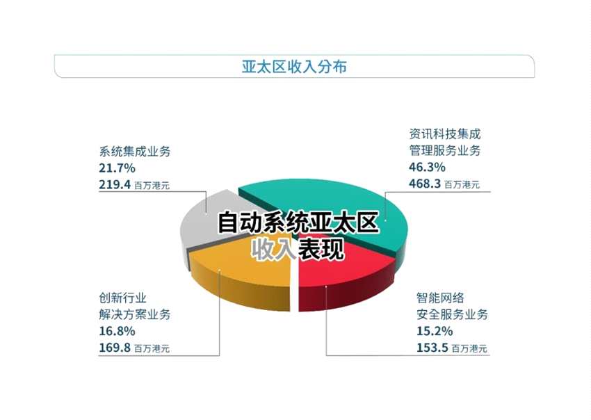據(jù)2020年中報顯示,自動系統(tǒng)亞太地區(qū)的業(yè)務(wù)主要由系統(tǒng)集成、創(chuàng)新行業(yè)解決方案、資訊科技集成管理服務(wù)、智能網(wǎng)絡(luò)安全服務(wù)四大部分組成,而后三者是公司亞太地區(qū)的主營業(yè)務(wù),收入合計占亞太地區(qū)總收入的比例高達(dá)近80%。