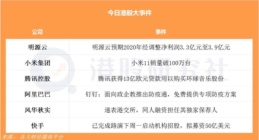 摘要: 港股研究社日?qǐng)?bào)重點(diǎn)關(guān)注:傳騰訊獲得13億歐元貸款用以購(gòu)買環(huán)球音樂股份小米11銷量破100萬(wàn)臺(tái)快手已完成路演下周一啟動(dòng)機(jī)構(gòu)招股,