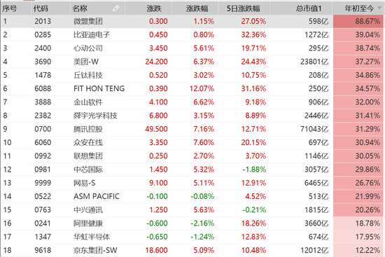 微盟集團漲89%,成為恒生科技表現(xiàn)最佳標(biāo)的,比亞迪(002594,股吧)電子、心動公司、美團、丘鈦科技、金山軟件、騰訊等漲超30%。恒騰網(wǎng)絡(luò)被剔除港股通,年內(nèi)暴跌89%,小米也跌超7%。