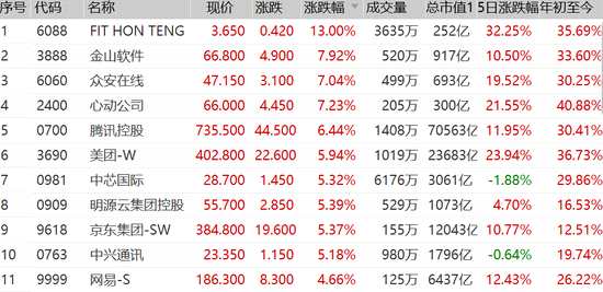 南下公募基金機構(gòu)抱團騰訊、美團等科技股,恒生科技指數(shù)大漲2.55%,一舉突破1萬點大關(guān),本月漲幅高達19.31%。其中,鴻騰漲13%,金山軟件漲8%,眾安在線、心動公司等漲超7%,騰訊漲6.44%,美團漲5%。