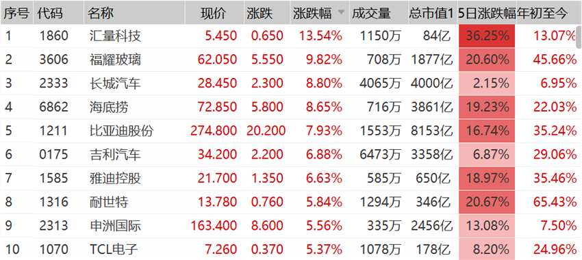 消費股方面,光伏概念福耀玻璃(600660,股吧)大漲10%,新能源汽車類股票長城汽車漲8.8%,比亞迪漲8%,吉利漲7%,雅迪漲6.6%。