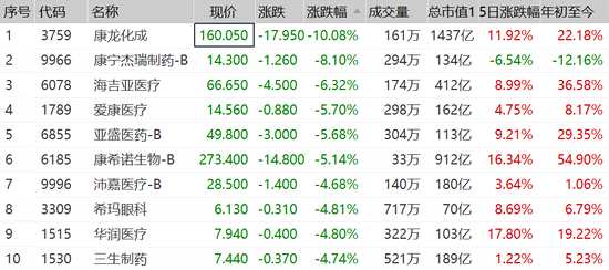 醫(yī)藥股暴跌,康龍化成(300759,股吧)跌超10%,康寧杰瑞制藥跌8%,海吉亞醫(yī)療跌寵愛6%,愛康醫(yī)療、康希諾、亞盛醫(yī)藥集體跌超5%。