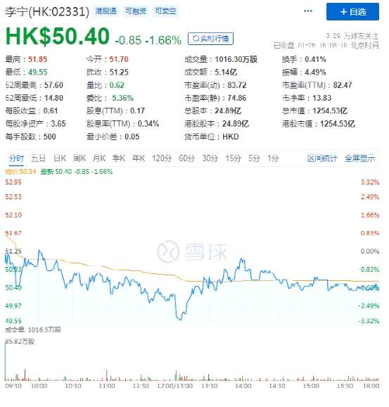 截至今日港股收盤(pán),李寧股價(jià)下跌1.66%,報(bào)50.40港元。