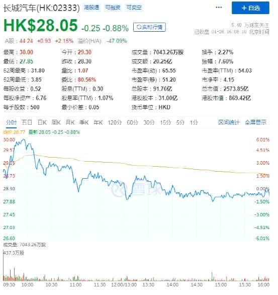 截至今日港股收盤(pán),長(zhǎng)城汽車(chē)股價(jià)下跌0.88%,報(bào)28.05港元。