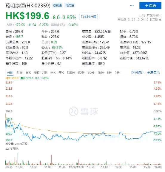 截至今日港股收盤(pán),藥明康德股價(jià)下跌3.85%,報(bào)119.6港元。