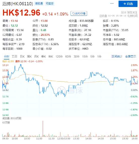 截至今日港股收盤(pán),滔博股價(jià)上漲1.09%,報(bào)12.96港元。