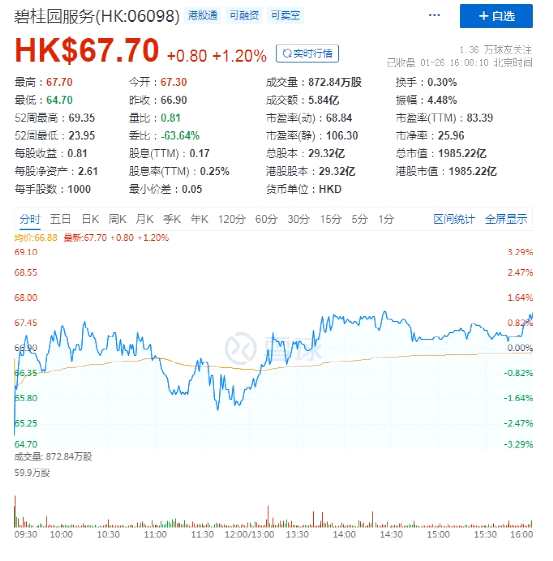 截至今日港股收盤(pán),碧桂園服務(wù)股價(jià)上漲1.20%,報(bào)67.70港元。