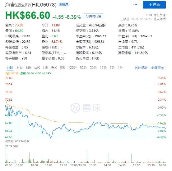 截至今日港股收盤(pán),海吉亞醫(yī)療股價(jià)下跌6.39%,報(bào)66.60港元。