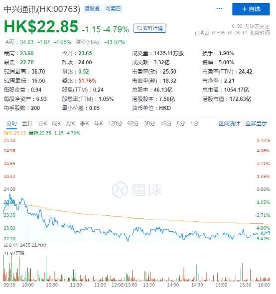 截至今日港股收盤(pán),中興通訊股價(jià)下跌4.79%,報(bào)22.85港元。