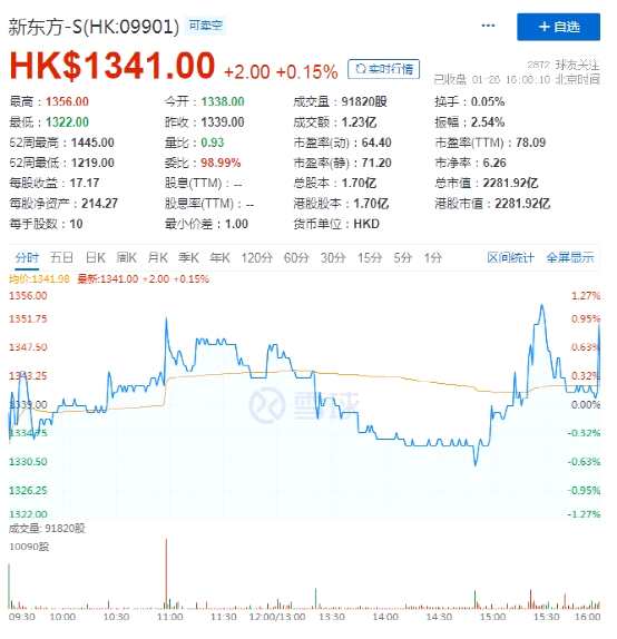 截至今日港股收盤(pán),新東方股價(jià)上漲0.15%,報(bào)1314.00港元。