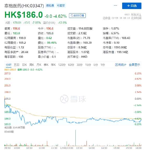 截至今日港股收盤(pán),泰格醫(yī)藥股價(jià)下跌4.62%,報(bào)186.0港元。