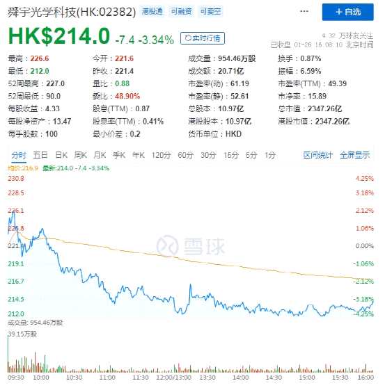 截至今日港股收盤(pán),舜宇光學(xué)股價(jià)下跌3.34%,報(bào)214.0港元。