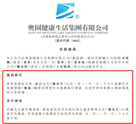1月27日消息,奧園健康發(fā)布公告,蘇波已于2021年1月27日起辭任集團(tuán)總裁職務(wù)并將留任集團(tuán)執(zhí)行總裁,負(fù)責(zé)管理集團(tuán)大健康業(yè)務(wù)的日常營運(yùn)。