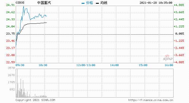 中國重汽(03808)早盤逆市上行,盤中漲超4%,截至發(fā)稿,漲4.21%,報24.75港元,成交額4813.83萬港元。