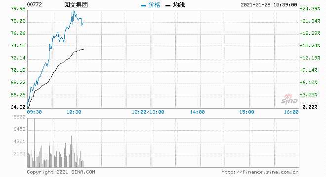 閱文集團飆升18%,報價75.88港元,早前閱文集團攜手騰訊與百度七貓成為中文在線(300364,股吧)戰(zhàn)略投資方。