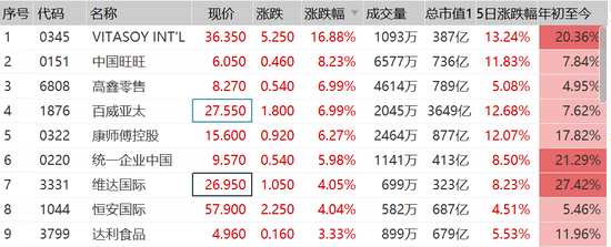 必需消費(fèi)品集體走高,其中,中國(guó)旺旺漲8%,高鑫零售、百威亞太漲7%,康師傅漲超6%,統(tǒng)一中國(guó)漲6%,維達(dá)國(guó)際、恒安國(guó)際漲4%。