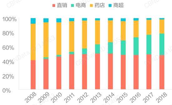 圖表四:2008-2018中國(guó)保健品銷(xiāo)售渠道分布情況