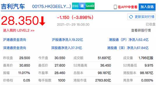 摘要: 查看最新行情新浪科技訊1月29日下午消息,吉利汽車港股收盤跌近4%,今日開(kāi)盤漲超3%。截至發(fā)稿,吉利汽車股價(jià)下跌3.9%,報(bào)28.4港元每股,市值約2784億港元。