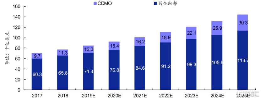 圖全球生物制藥生產(chǎn)市場規(guī)模預(yù)測:藥企內(nèi)部 vs CDMO