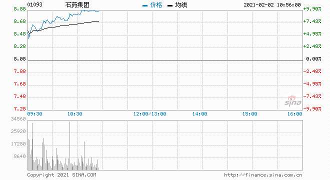 摘要: 2月2日消息,石藥集團(tuán)股價(jià)大漲10%,現(xiàn)報(bào)8.89港元,市值達(dá)1064億港元。