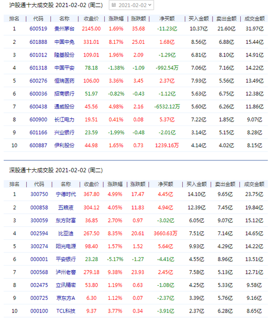 2月2日消息,北向資金凈買入32.81億元,今日凈買入陽光電源(300274,股吧)5.64億元、長江電力(600900,股吧)5.37億元,凈賣出貴州茅臺(600519,股吧)11.23億元、平安銀行(000001,股吧)4.41億元。