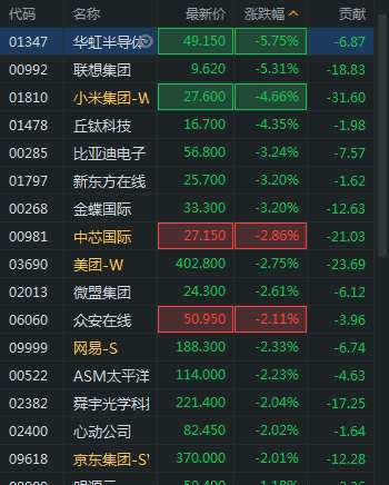 2月4日消息,恒生科技指數(shù)跌近2%,華虹半導(dǎo)體跌5.75%,聯(lián)想跌5.31%,小米跌4.66%,中芯國(guó)際跌2.86%,美團(tuán)跌2.75%。