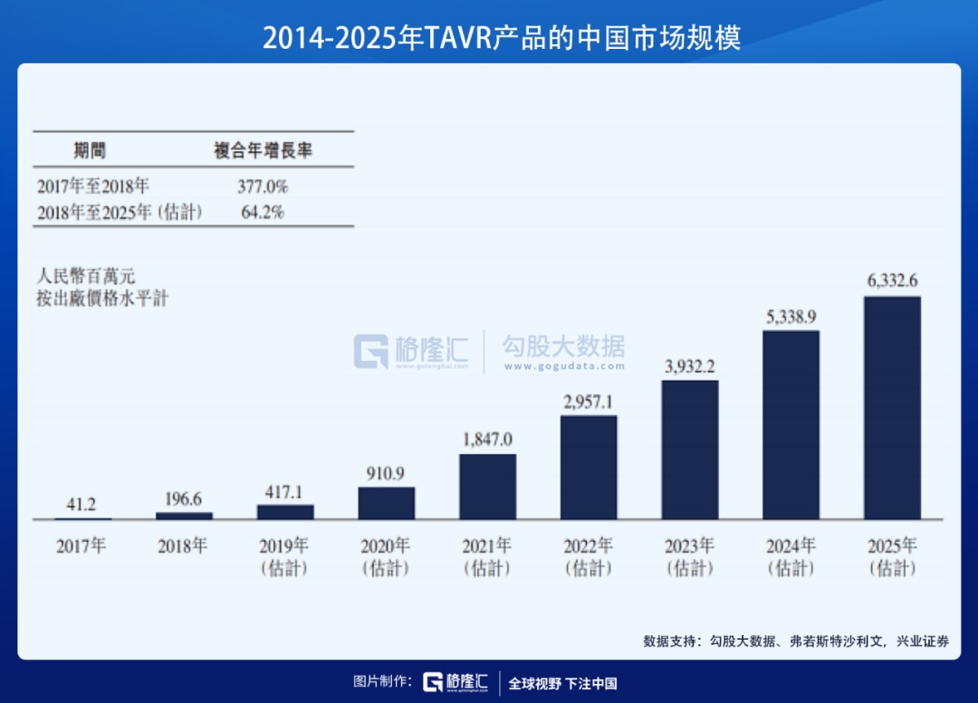 全球TAVR產(chǎn)品市場由2014年的15億美元增至2018年的41億美元,復(fù)合年增長率為27.8%,且預(yù)期將進(jìn)一步增至2025年的104億美元,2018年至2025年的復(fù)合年增長率為14.3%。