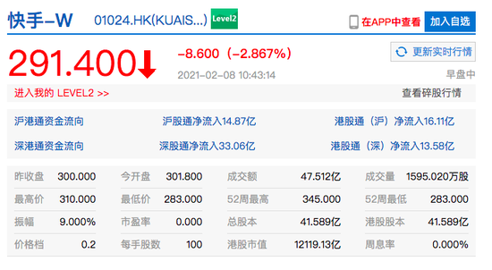 摘要: 查看最新行情新浪科技訊2月8日上午消息,港股快手一度跌逾5%成交額超47億港元。截至發(fā)稿,快手股價(jià)下跌2.9%,報(bào)291.4港元每股,市值約12119.1億港元。
