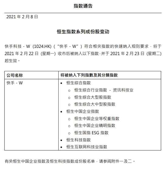 恒生指數(shù)公司公告稱,快手科技符合快速納入標(biāo)準(zhǔn),將于2月22日收市后被納入恒生綜合指數(shù)、恒生中國企業(yè)指數(shù)、恒生科技指數(shù)及恒生互聯(lián)網(wǎng)科技指數(shù)。