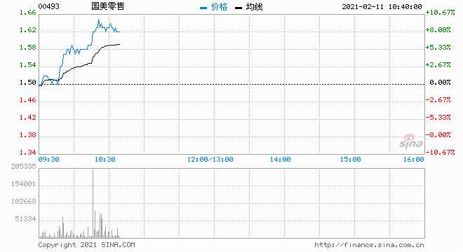 2月11日消息,國(guó)美零售漲8.67%,報(bào)1.63港元,盤中一度漲超9%創(chuàng)歷史新高,最新市值351.31億港元。