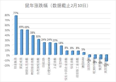 全球主要股指來(lái)看(1月25日至2月10日),創(chuàng)業(yè)板指暴漲77%傲視全球,深證成指漲49%,納斯達(dá)克指數(shù)漲49%,韓國(guó)指數(shù)、臺(tái)灣指數(shù)、日經(jīng)指數(shù)、上證指數(shù)等漲超20%。港股恒指漲7.6%,國(guó)企指數(shù)漲7.8%,不過(guò),恒生科技指數(shù)暴漲92%。