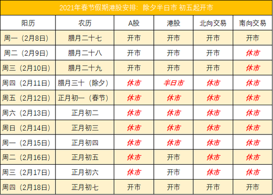 南向交易周二(2月9日)休市,2月18日(正月初七)恢復(fù)交易;北向交易除夕(2月11日)起休市7天,2月18日(正月初七)恢復(fù)交易。