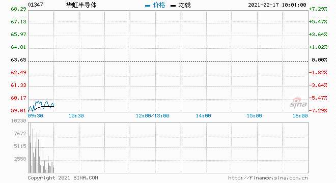 華虹半導體(1347.HK)低開7.46%,報58.9港元,最新總市值765.24億港元;該股此前連漲四個交易日,累計漲幅約38%。