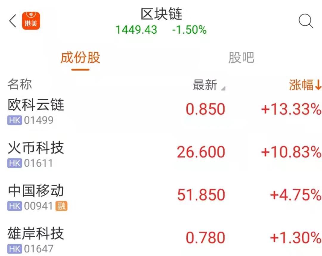 比特幣創(chuàng)歷史新高 火幣科技(01611)張超10% 歐科云鏈(01499)漲13.33%