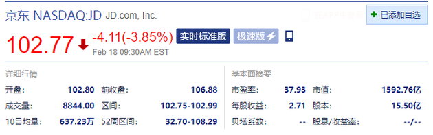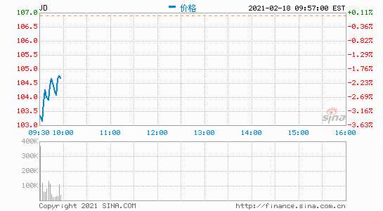 新浪科技訊 2月18日晚間消息,美股開盤,京東跌超3.8%,報102.77美元,當前市值1592億美元。此前,京東物流向港交所提交招股書。