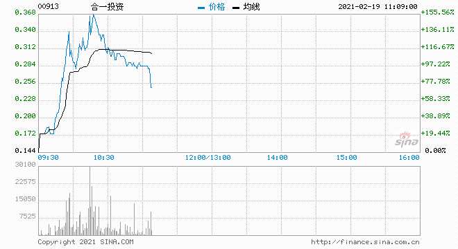 合一投資(0913.HK)飆升逾129%,暫列港股市場漲幅第一,報0.33港元,高見0.355港元創(chuàng)逾一年來新高,成交434萬港元。