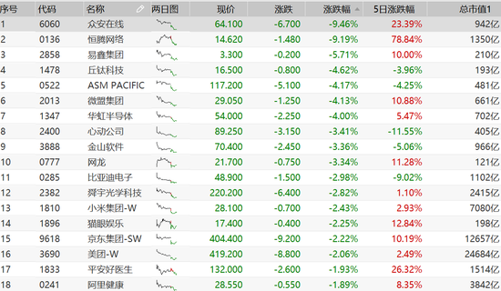 恒生科技指數(shù)跌超3%,眾安在線、恒騰網(wǎng)絡(luò)跌超9%,易鑫集團(tuán)、丘鈦科技、微盟等跌超4%。