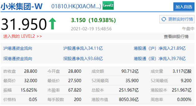 新浪科技訊 2月19日下午消息,小米集團快速拉升,現(xiàn)漲近11%,市值重回8000億港元關口。