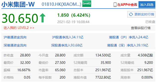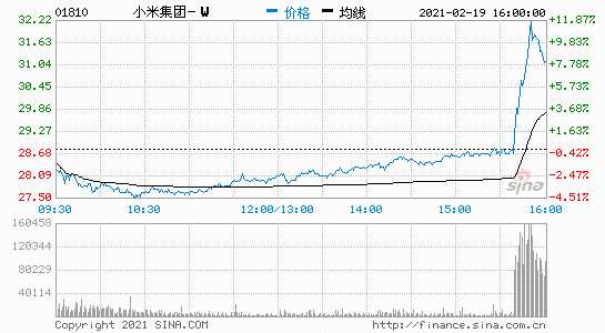 新浪科技訊 2月19日下午消息,小米集團收漲6.42%,報30.65港元。