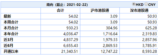 2月22日消息,南向資金今日凈買入港股54.02億港元,今年以來凈買入港股規(guī)模突破4000億港元。