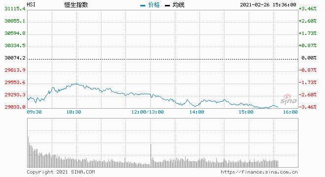 摘要: 恒指尾盤加速下挫,盤中跌超千點,考驗二萬九千點關(guān)口。截至發(fā)稿,恒指跌3.33%,報29072.08點,大市成交額2318.34億港元。恒指成份股普跌,多只個股跌幅超5%。