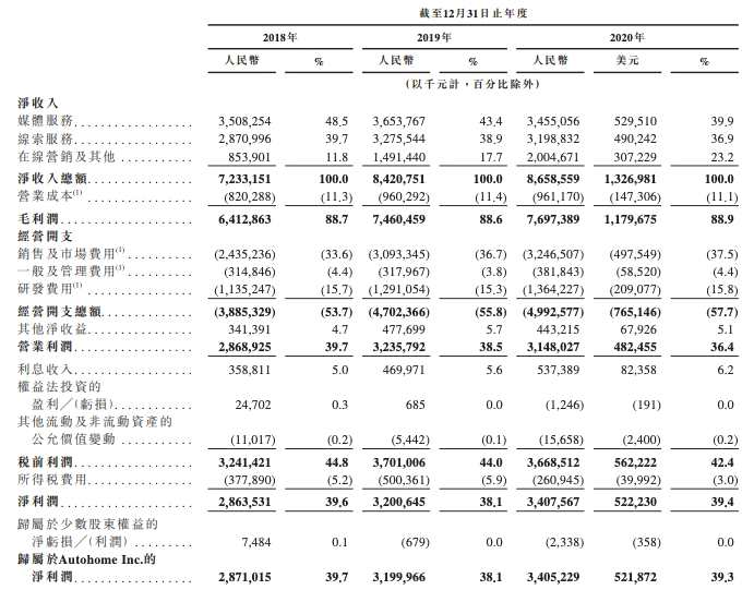 文件顯示,汽車之家2018年至2020三年的凈收入分別為人民幣72.33億元、84.2億元和86.58億元,歸屬于Autohome Inc.的凈利潤由2018年的人民幣28.71億元增長11.5%至2019年的人民幣32億元,并進(jìn)一步增長6.4%至2020年的人民幣34.05億元。數(shù)據(jù)分析可見,汽車之家2020年凈收入與凈利潤增速明顯放緩,2019年凈收入增速為16.4%,2020年增速僅為2.8%;2019年凈利潤增速為11.5%,2020年增速僅為6.4%。