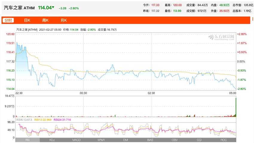 2013年12月12日,汽車之家在紐交所掛牌上市,開盤價(jià)30.16美元。截止2月28日美股收盤,汽車之家收于114.04美元,較前一交易日下跌2.8%,總市值約135.8億美元。