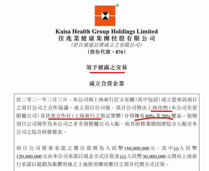 公告稱,成立項目公司后,項目公司將由上海佳煦(佳兆業(yè)健康全資附屬公司)及伏虎合作社(上海新行的指定實體)分別擁有80%及20%權(quán)益。