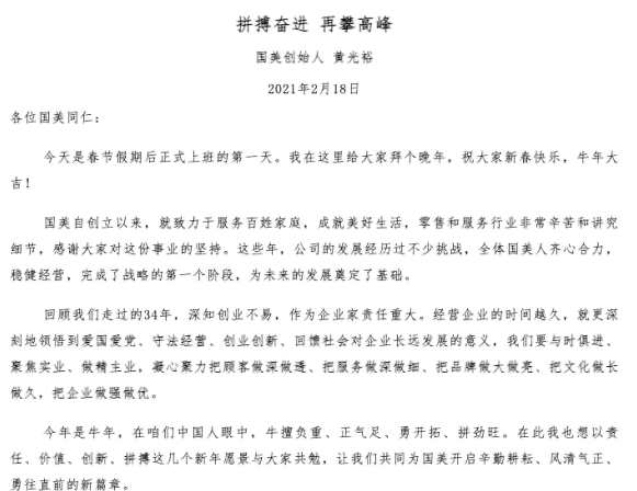 值得注意的是,黃光裕的回歸,不僅讓國美系的股價上漲,關(guān)于公司的傳聞以及討論也逐漸多了起來。日前,網(wǎng)上流出了最近國美控股集團全國高管閉門會的一張圖片,從圖片中可以看到,國美零售的銷售收入1月同比增速達(dá)到74%,2月銷售同比增速更是達(dá)到了124%。