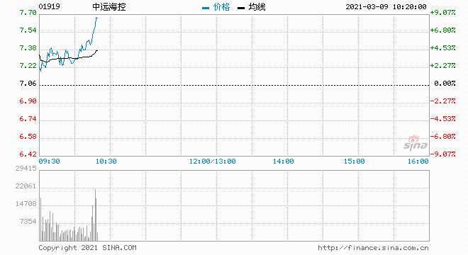 港股中遠(yuǎn)???601919,股吧)大幅拉升至8.22%,報(bào)7.64港元,總市值1412億港元。A股現(xiàn)已漲停。