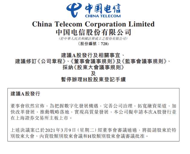 中國電信:擬申請本次A股發(fā)行并在上海證券交易所主板上市